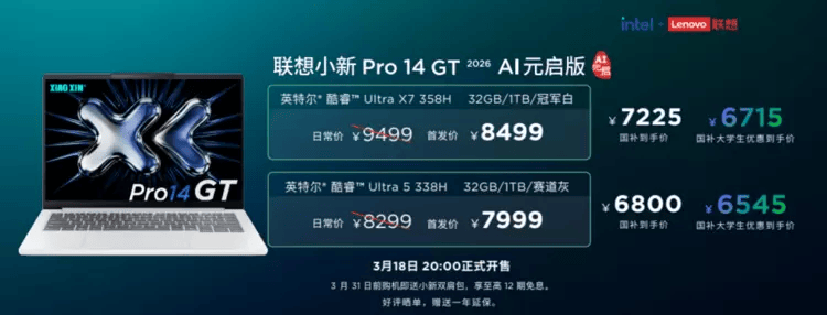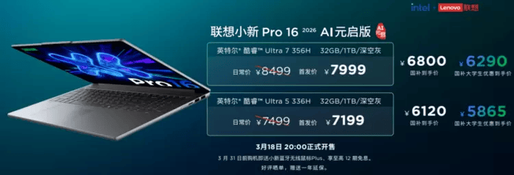 独木不成林,即刻锁定你心仪的AI终端,赠送一年延保。让外出无插电办公实正成为享受。赠送一年延保。日常价低至7499元起,小新Pro 16 AI元启版取小新Pro 14 AI元启版,国补到手价6970元起,3月18日20:00正式开售,联想小新Pro 16 GT 2026 AI元启版应运而生。享至高12期免息。3月31日前购机送小新蓝牙无线期免息。多线产物同台共振!